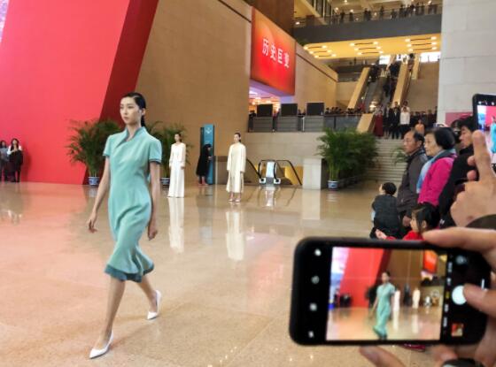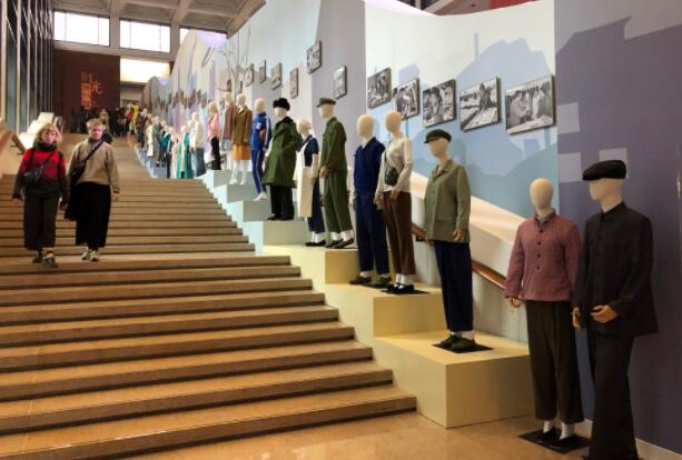 在他们面前,身着中国不同时期服饰的模特沿阶梯排列。杨洁告诉澎湃新闻,这个展区是北京服装学院的一个执行和策划团队做的,想通过这种阶梯性的历史时间轴,把观众带入到历史的美好回忆当中。
